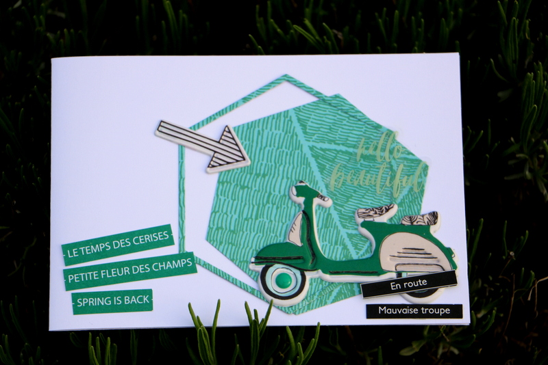 Pour cette carte je trouvais ce scooter tellement sympa que je voulais en faire le centre de ma carte, j’ai donc choisi de découper des hexagones pour les mettre en fond de page. Des étiquettes et un stickers transparent pour finir de décorer la carte.